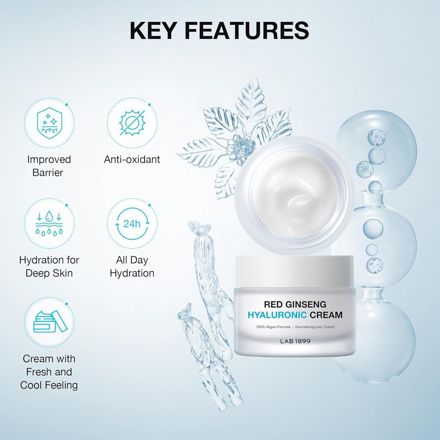 - 하루 종일 지속되는 깊은 보습: 홍삼 히알루로닉 크림은 피부 깊숙한 곳까지 수분을 공급하여 오래 지속되는 보습 효과를 선사합니다.